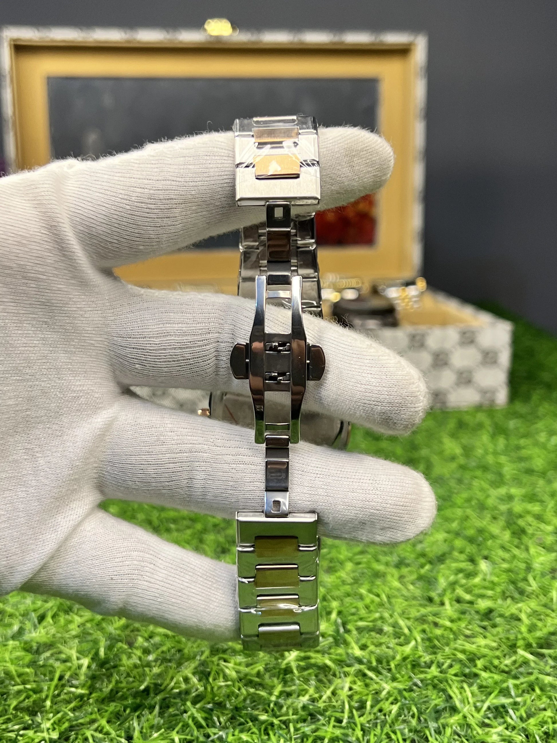 The two-tone chain bracelet is a striking combination of black and silver links, giving the watch a unique and sophisticated appearance. It adds a touch of edginess, making it suitable for both formal and casual outfits.